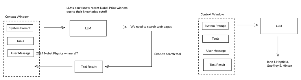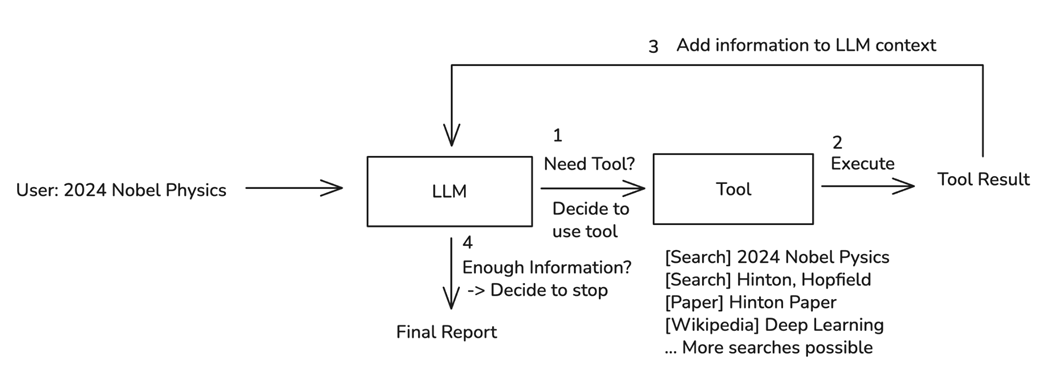 The LLM Agent's decision loop is an iterative process of LLM decision-making and tool use.
