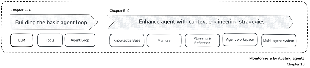 To evaluate agent capabilities, the chapter adopts GAIA, a benchmark of multi-step, real-world questions that demand reasoning, retrieval, and calculation—ideal for iterating on agent designs and quantifying improvements. It then broadens prompt engineering into context engineering: the discipline of curating everything the model sees—system instructions, conversation state, tool outputs, and retrieved knowledge—at the right time and granularity. Most real failures come from missing information rather than insufficient model intelligence, and larger contexts can degrade performance, so relevance and focus matter. The chapter outlines five strategies—Generation, Retrieval, Write, Reduce, and Isolate—that will be layered through the book’s implementation roadmap, alongside practical prerequisites (Python, environment setup, API keys, and cost awareness) to equip readers to build, measure, and iteratively improve agents from scratch.