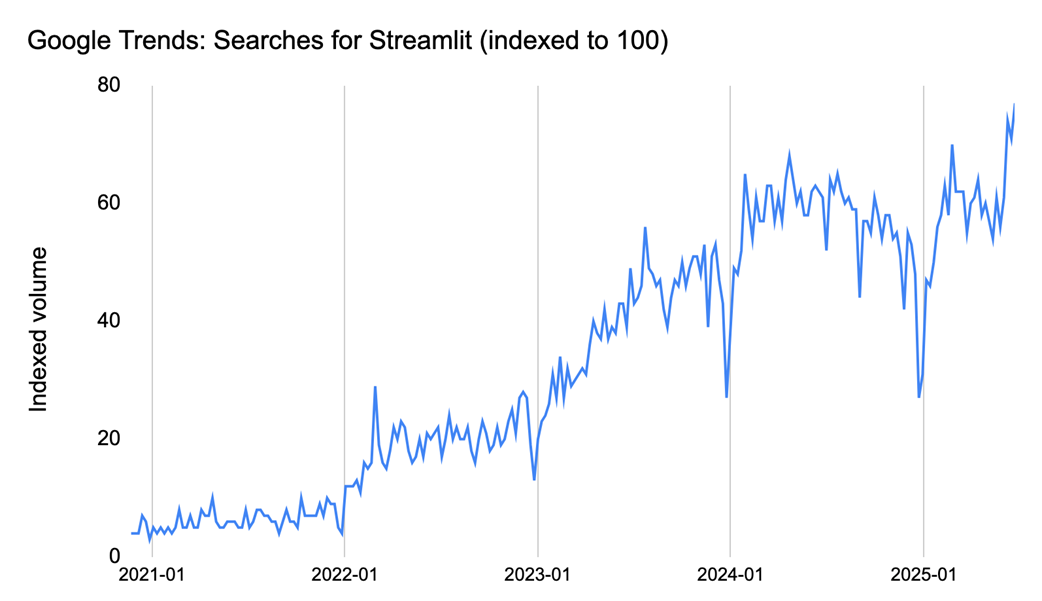 A Google Trends chart showing the popularity of Streamlit over time (note: the periodic dips near the end of each year correspond to the week between Christmas and New Year's Day, when I assume relatively few people are working).