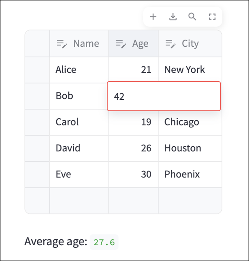 An editable Pandas dataframe as displayed in Streamlit (see chapter_01/data_editor_example.py in the GitHub repo).