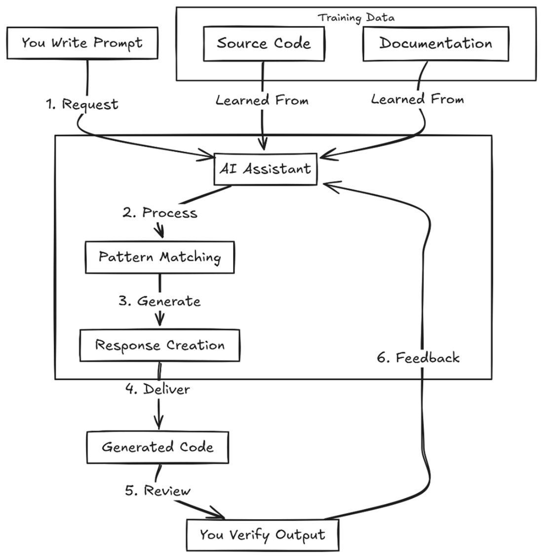 Integrated tools use a sophisticated system to generate code. It starts with your prompt, and the assistant gathers up documentation, and source code to see if your answer can come from these sources. It makes a best guess at what you’re looking for and generates a response. Your acceptance of these responses helps train the assistant in the future (unless you’ve blocked feedback).
