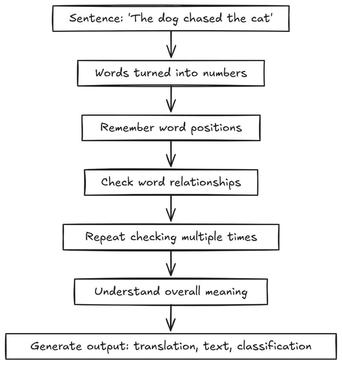 A transformer takes a sentence and analyzes word positions and relationships to try and extract meaning from the text it sees.