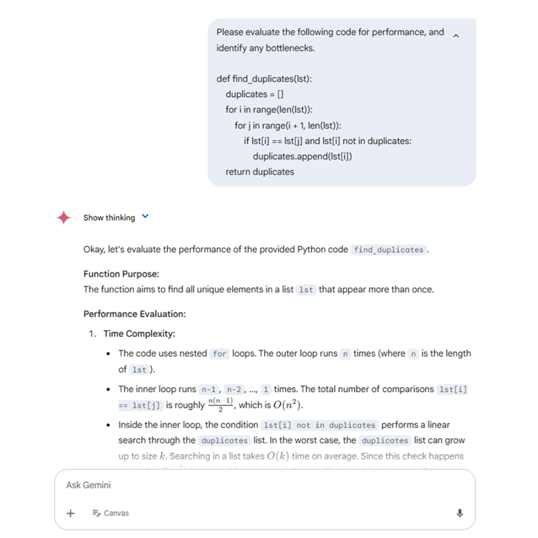 Even with a few lines of code Gemini can analyze it and make suggestions to improve it.
