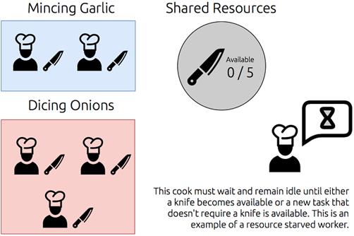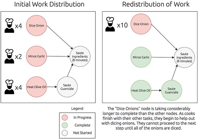 A graph with nodes distributed to many workers depicting dynamic redistribution of work as tasks complete at different times.