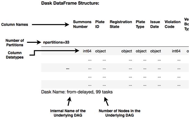Computations on Dask DataFrames are structured by the task scheduler using DAGs.