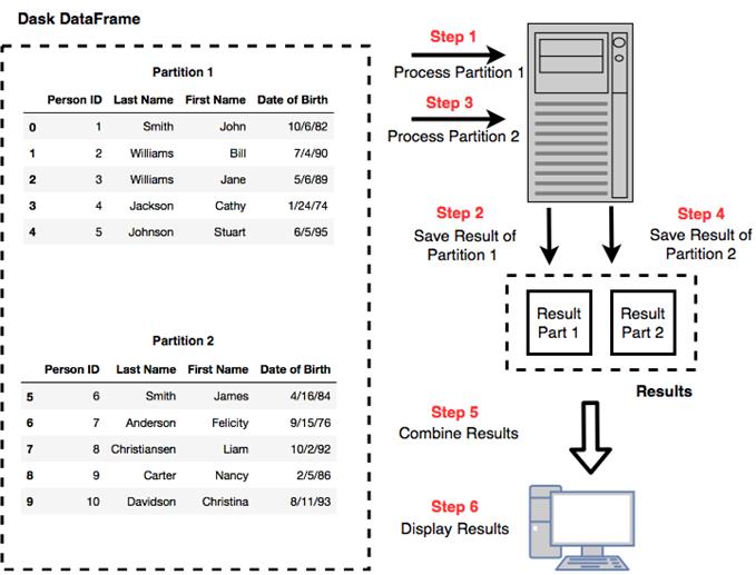Dask splits large data files into multiple partitions and works on one partition at a time