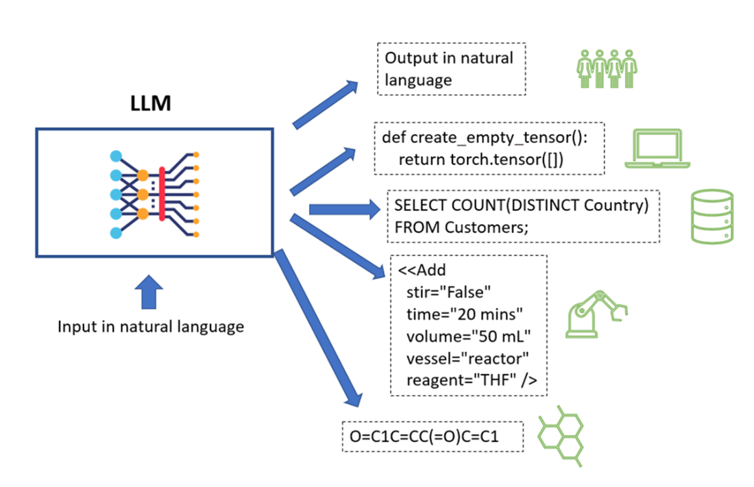 LLMs can generate any symbolic content including code, math expressions, and structured data.