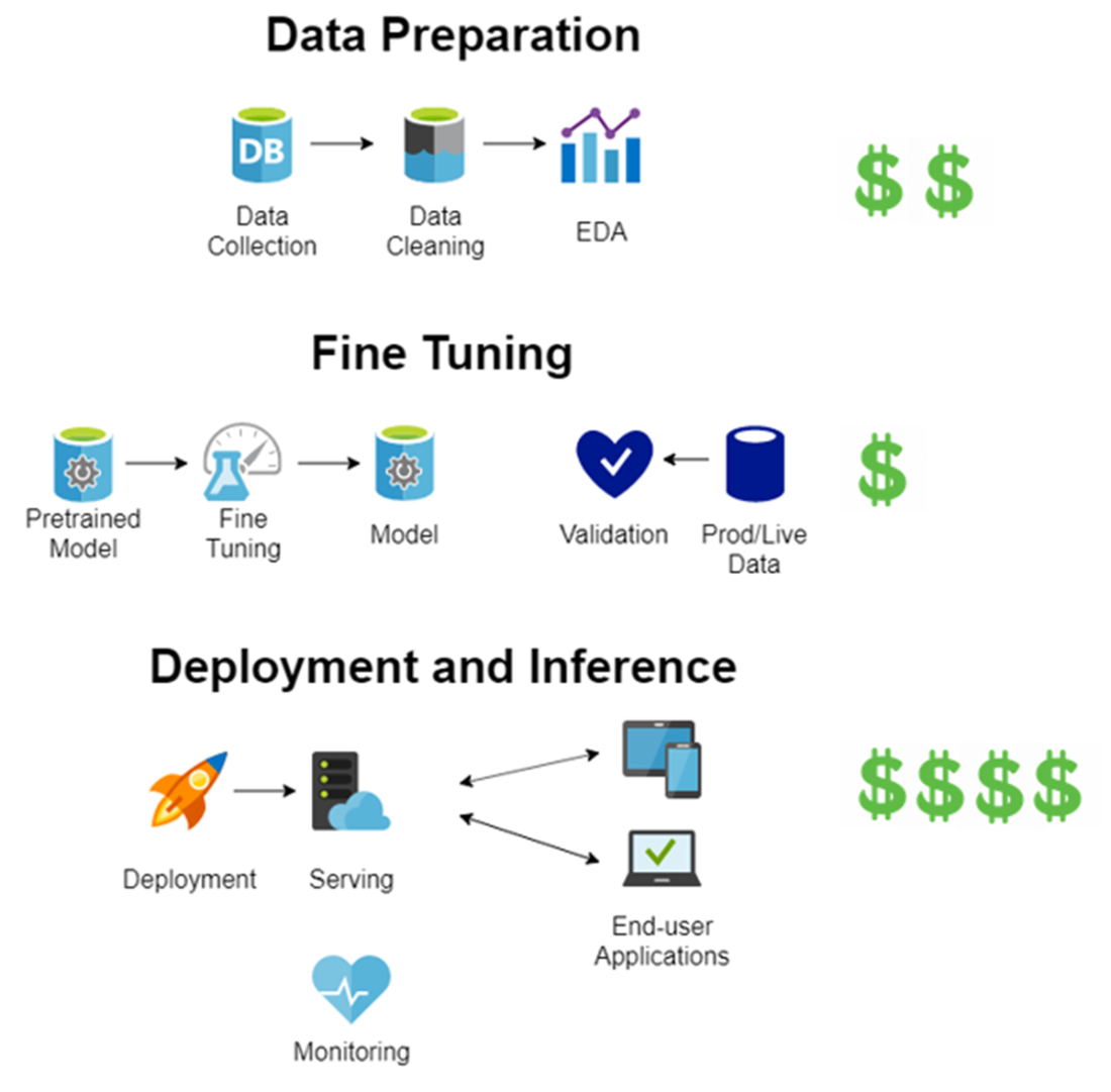 Order of magnitude of costs for each phase of LLM implementation when starting from a pretrained model.