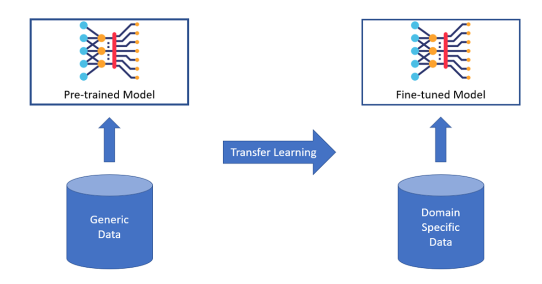 Transfer learning adapts pre-trained models to specific domains using domain-specific data.