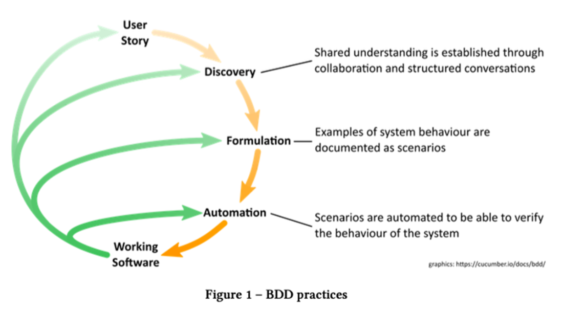 BDD is an agile, collaboration-first approach composed of three core practices: discovery, formulation, and automation, applied to small, valuable slices of functionality described by user stories. In discovery, cross-functional teams explore rules through concrete examples in requirement workshops; in formulation, those examples become business-readable scenarios (often using Given/When/Then and Gherkin) that stakeholders can review; in automation, scenarios are wired to executable tests (via tools such as Cucumber or Reqnroll) that drive implementation and become living documentation. BDD complements TDD: scenarios define the outer “behavior” loop, while unit-level TDD implements the inner loop, yielding fast feedback, reduced rework, and a persistent specification that evolves with the product. Testers remain essential, especially for discovery and exploratory verification, even as more regression checking becomes automated.