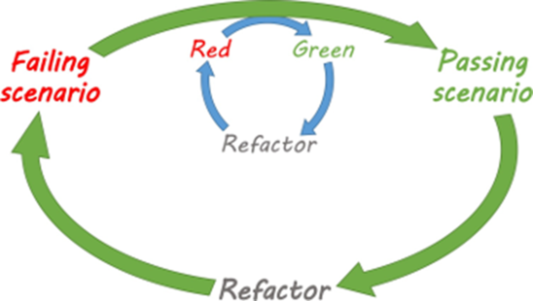 The BDD cycle is the outer loop – write a failing scenario, get the scenario to pass, then refactor. We enter the inner, TDD cycle to implement the code needed to move from a failing scenario to a passing scenario.
