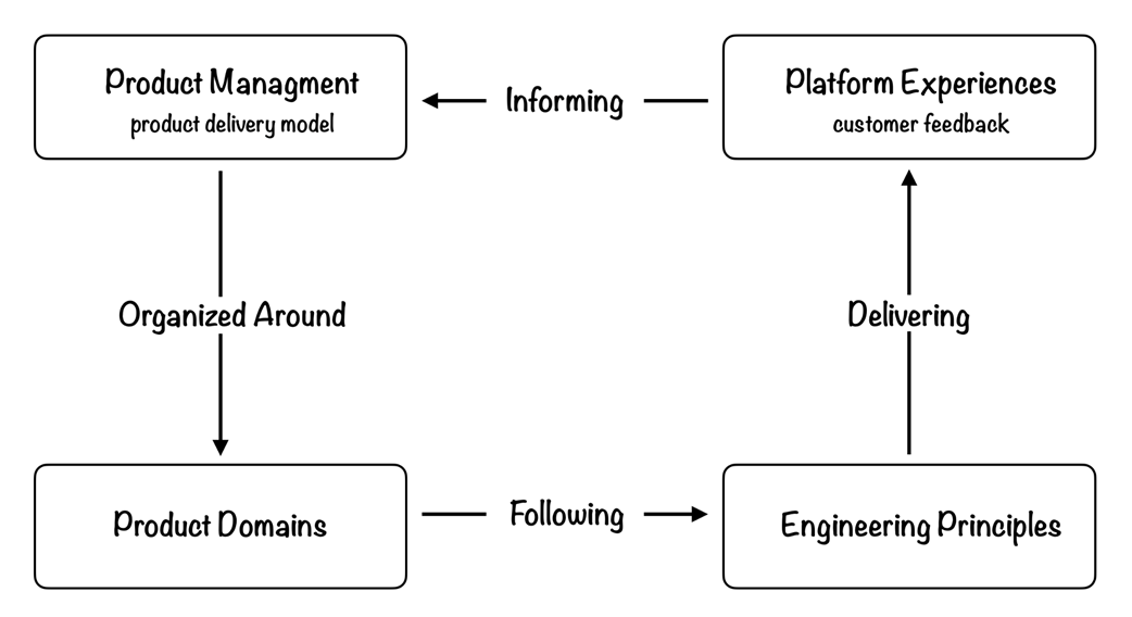 Platform engineering depends on the disciplined application of a Product Delivery Model. Product management drives decisions about the product’s capabilities, features, and experiences. Effective platform engineering principles enable us to deliver capabilities, features, and experiences more successfully. Identifying and architecting around the internal Product Domains of our platform is how we successfully sustain the user experience as the product evolves and scales.