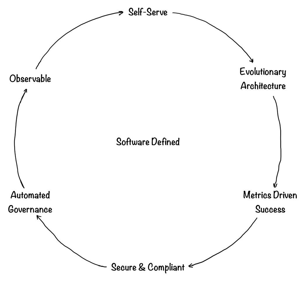 Software Defined is placed in the middle because it is a core attribute of everything the platform engineer delivers. The rest of the principles share a connection because they continuously evolve, and decisions made in applying these surrounding principles can impact the requirements of the others.