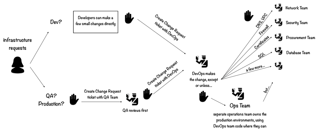 Infrastructure-oriented changes can go through as many as four handoffs by the time they reach the team that actually does the work. Each of these teams is only allowed to optimize a process within its own team’s scope of responsibilities.