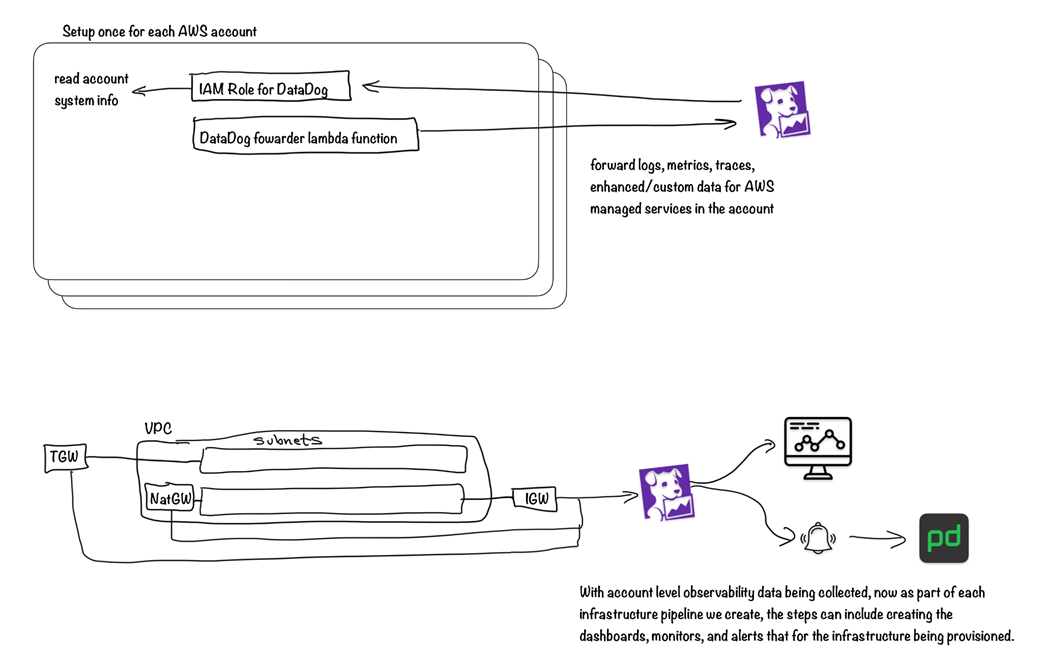 If Epetech were using DataDog, it is at this point that we would set up a repository and pipeline to manage the account-level integration provided by DataDog for AWS. With that integration in place, with each additional capability or feature we implement, like the networks we will provision in section 7.2, observability would be a part of the natural definition of done for the implementation.