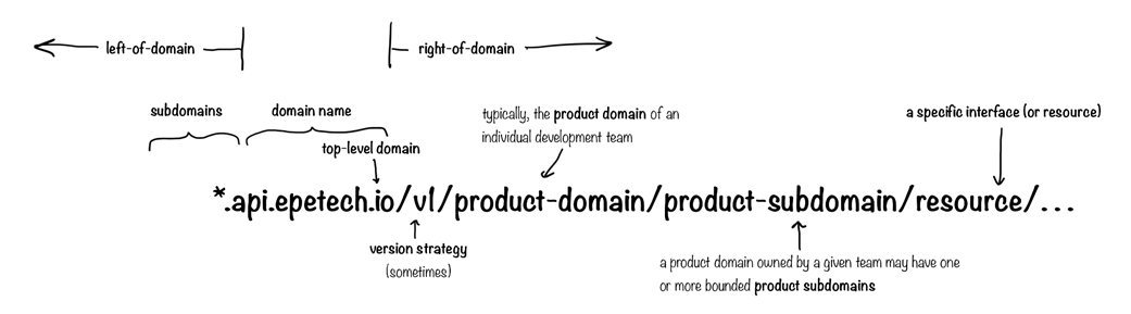 - The left-of and right-of domain naming patterns for APIs and services are primarily a business-level product value decision.
