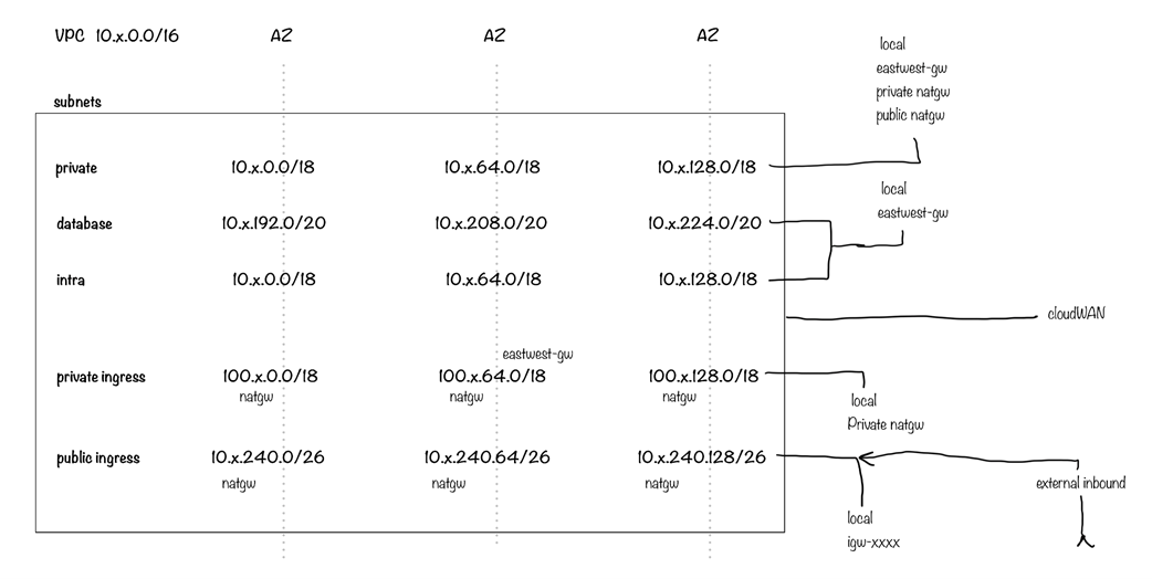 - Provision VPCs and subnets in specific regions with designated IP spaces to support different roles, such as nodes, databases, and ingress.