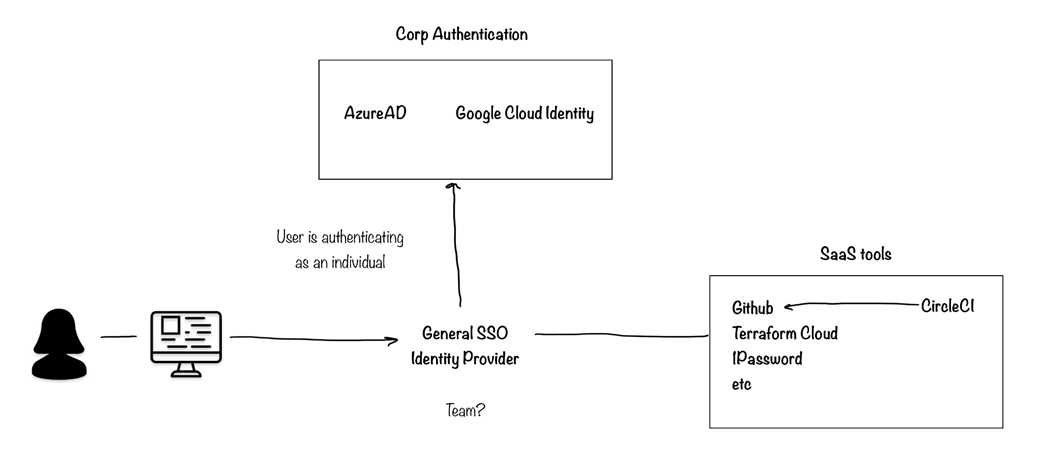 For the SAAS tools that will be a part of our platform, the common enterprise SSO integration for authentication is a good starting point. Some tools, like CircleCI, can integrate directly with GitHub authentication and do not necessarily need an independent integration.