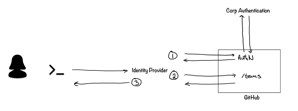 For Epetech, we would like our identity provider service to have built-in or easily configurable means of integrating with GitHub, requiring authentication through whatever means we have set up in GitHub. As a result of (1) successful authentication, we want the IDP to (2) get the list of all teams the user is a member of in our GitHub organization. Finally, we want to (3) return to the user a secure means of accessing the Platform infrastructure or custom API resources.