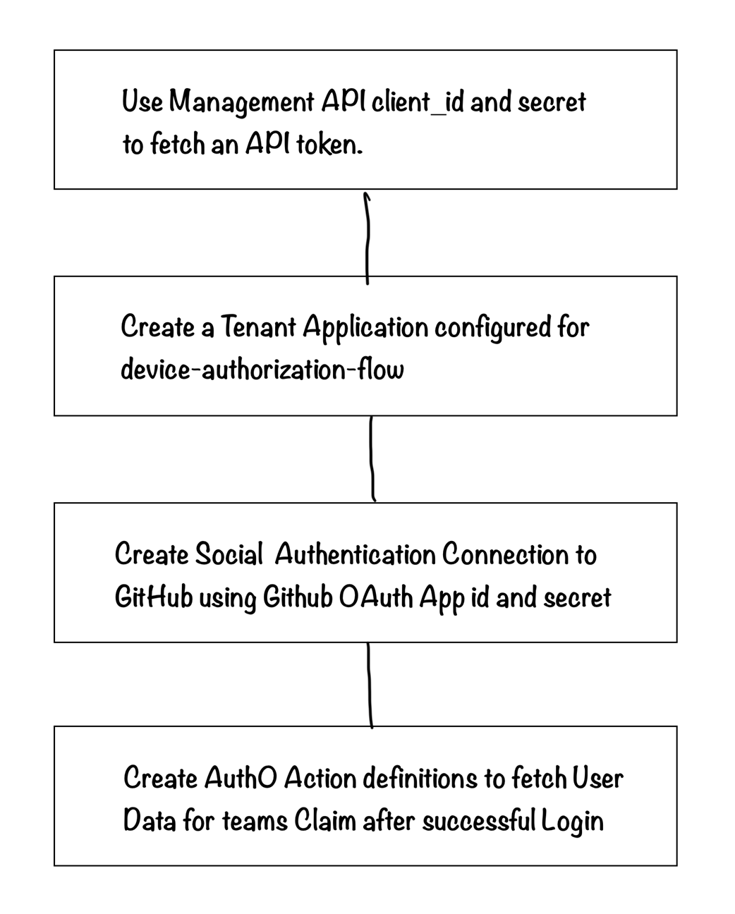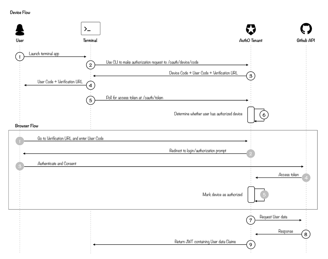 In this authentication and authorization flow, the IDP acts just as a secure go-between. The user must authenticate through GitHub and grant their device authorization to receive a JSON Web Token.