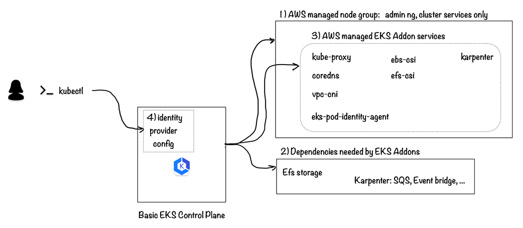 The chapter then separates customer identity from cloud IAM to enable a cohesive, cross-tool experience: authenticate via enterprise SSO, authorize by team membership (e.g., GitHub Teams), and issue verifiable tokens using an OIDC device flow through a SaaS IdP (such as Auth0). This identity is integrated with Kubernetes and EKS to drive RBAC and SSO across clusters. Finally, the Cloud Service Control Plane Base sets up EKS with AWS-managed add-ons (networking, DNS, storage drivers, pod identity) and Karpenter for elastic, continuously refreshed compute, plus an EFS target for durable, multi-writer storage. Robust validation combines cloud resource checks and cluster health tests with functional workloads (PVC expansion, EFS multi-write, dynamic node provisioning). Operational guidance centers on frequent, automated updates to managed add-ons, controlled but regular upgrades of Kubernetes and charts, safe refresh of managed node groups, and a developer CLI that streamlines login and kubeconfig generation using the platform’s customer identity.