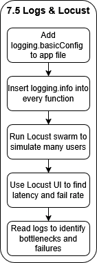 We will add logging to our file to catch any errors, then run Locust to simulate users and cause our app to fail. We will use the Locust dashboard and logs to find bottlenecks so we can fix them.