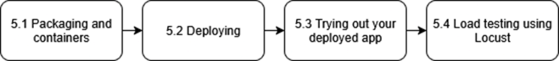 This flowchart shows the key stages of this chapter. We will start by packaging our app as a container, then deploy it to Azure’s app service, then test it remotely. Finally, we will perform load testing using logging and simulated users with Locust.