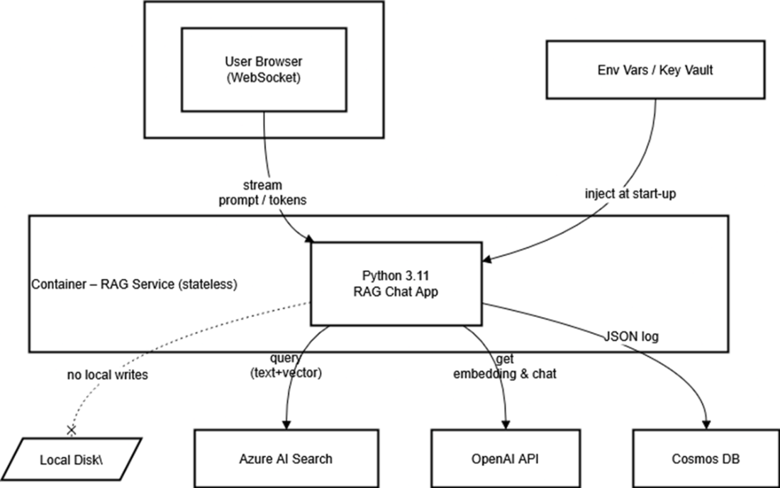 The RAG container keeps no secrets and writes nothing to its own disk; it simply streams prompts from the browser, fans out to AI Search and OpenAI for retrieval and generation, and drops a JSON record into Cosmos DB for posterity. All configuration arrives at launch via environment variables or a key vault. The dashed line to “Local Disk” drives home the point: local storage is strictly off-limits in a truly stateless service.