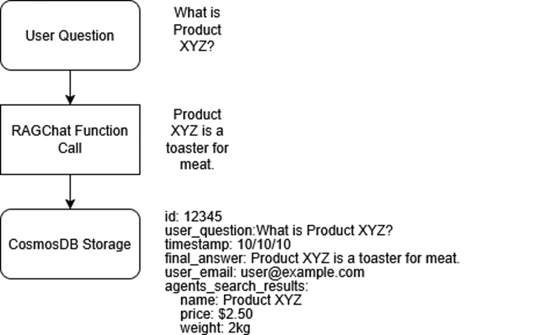 An overview of the new logging path: each answer that streams to the user is also packaged into a JSON document and sent over HTTPS to Cosmos DB, where it can be queried later to debug slow responses, audit model behaviour, or train future ranking tweaks..