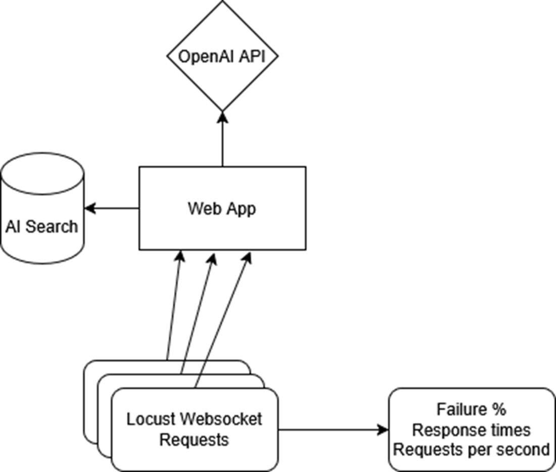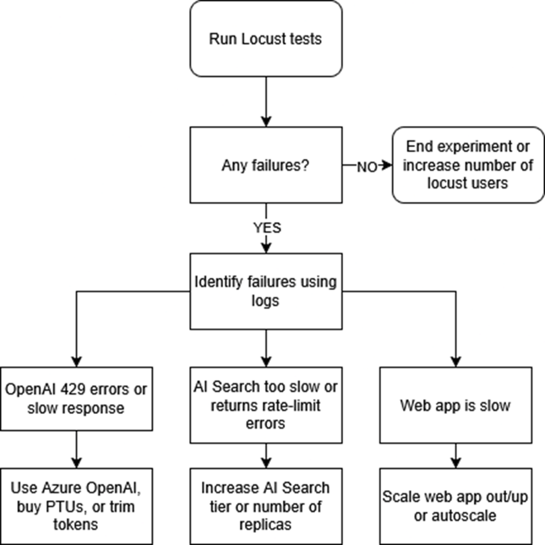 If we experience any failures during out Locust tests, we first look at our logs in our web app. Next, once we have identified the error, we fix it by scaling out that particular part of our system. For example, if we are getting rate limits from OpenAI, we increase the amount of requests we can send.