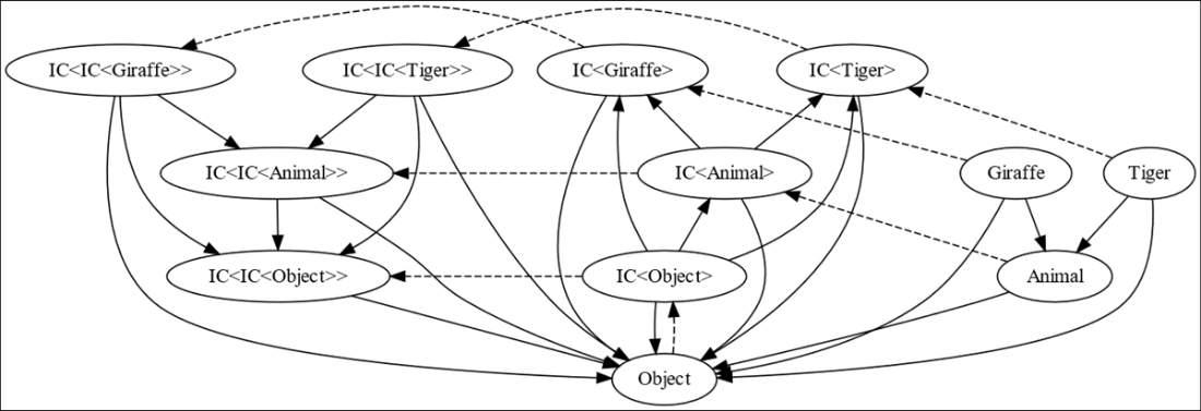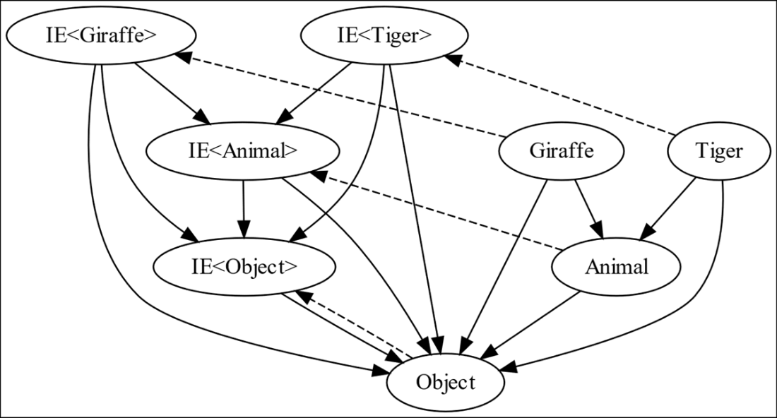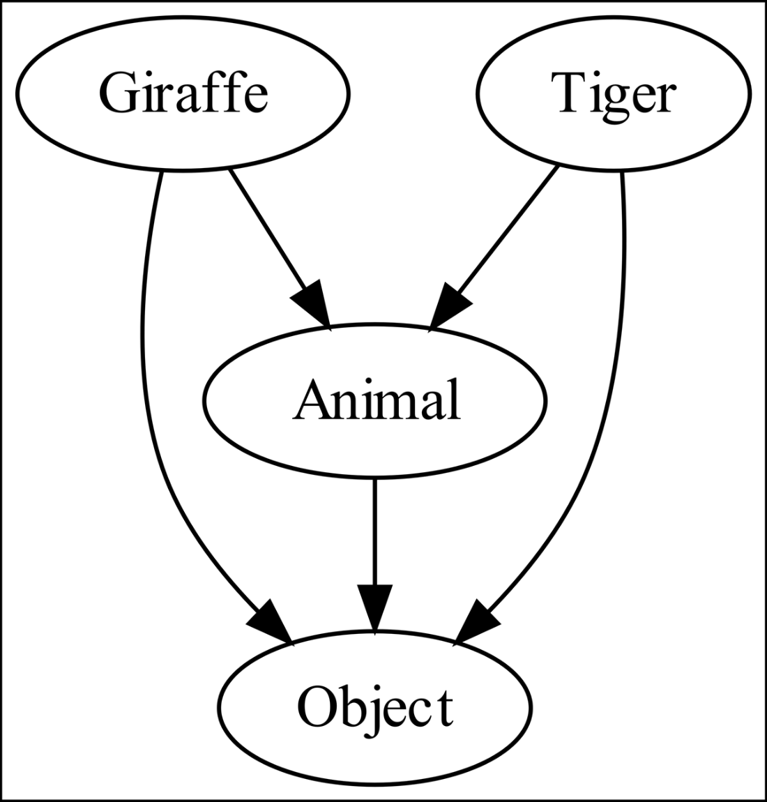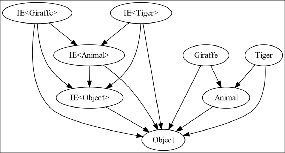 The category of four types with the assignment compatibility morphism; the identity morphisms are elided for clarity. Note that both Giraffe and Tiger have morphisms to Animal but not to each other. A Giraffe can’t be assigned to a variable of type Tiger and a Tiger can’t be assigned to a variable of type Giraffe, but both can be assigned to a variable of type Animal or Object.