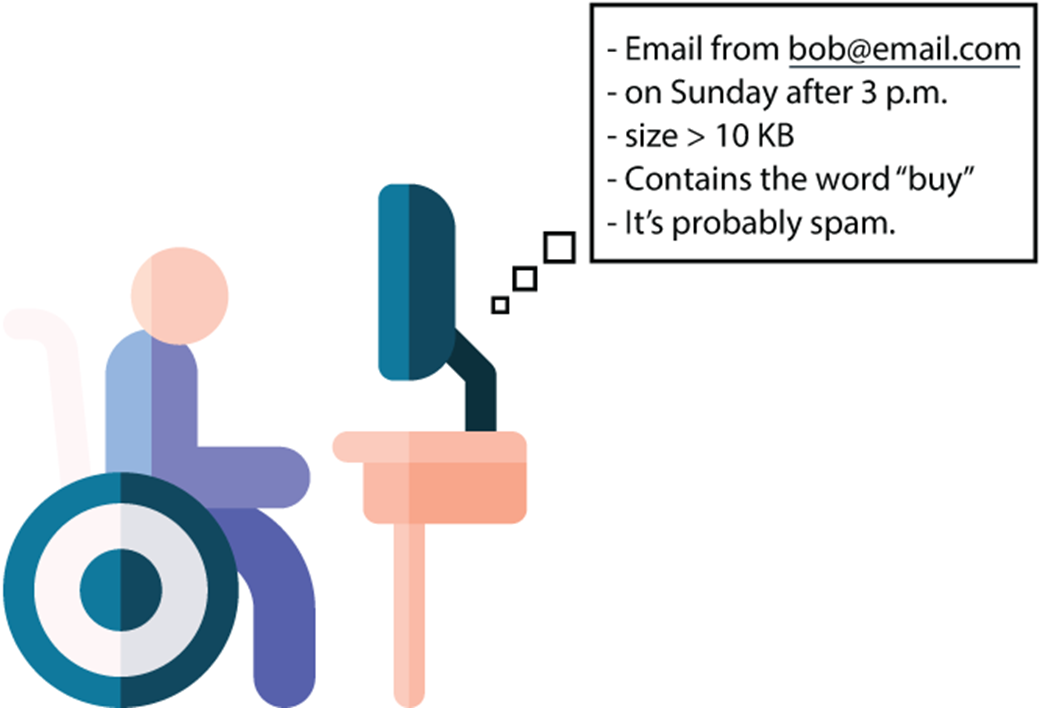 Through a running spam-detection example, the chapter shows how models evolve from simple frequency counts to rules that use informative features (like day of week or email size), then to richer combinations a computer can search efficiently. The lesson is that ML scales this rule-finding process: computers explore many candidate models and select those that fit past data and, ideally, generalize. The chapter closes by contrasting predictive ML (classification and regression) with generative ML (creating text or images), noting that the book focuses on predictive methods—building intuition from scratch implementations before using popular libraries—while offering a glimpse of generative techniques once the foundations are in place.