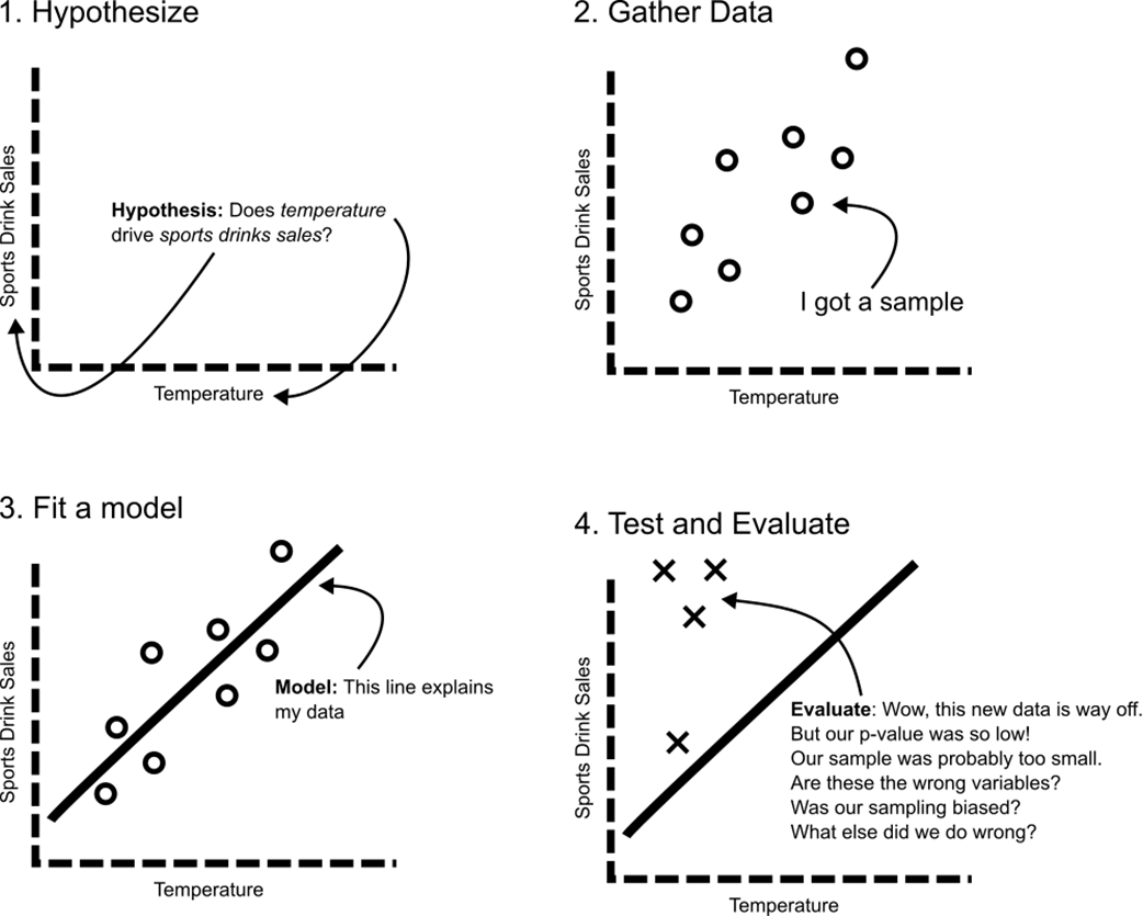 An example of the four steps in statistics, studying whether temperature has an impact on sports drinks sales.