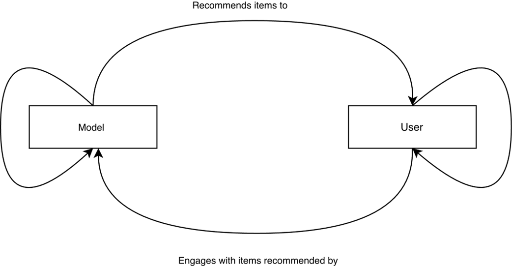 The feedback loop between user and recommender systems. Users and recommender systems are in a mutual feedback loop, with the output of one serving as the input to the other. The output of the algorithm, the recommendations, is the input for the users. The users’ output, what they engage with, is a signal for the recommender. On top of that, both the user and the recommender system update their internal state. Users change their minds and evolve their preferences over time, while algorithms learn users’ preferences and try to align more with them.