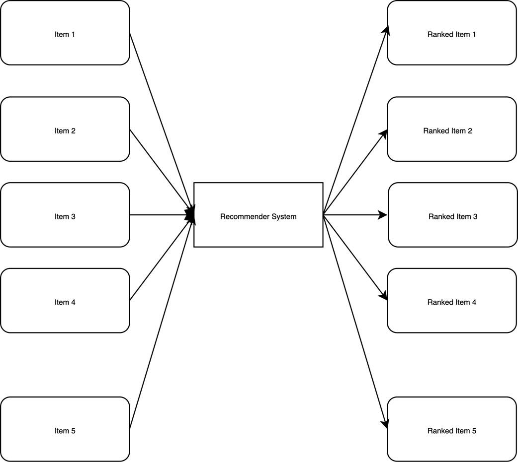 Given a list of items, this recommender system reranks them according to a predefined metric, such as value to the user.