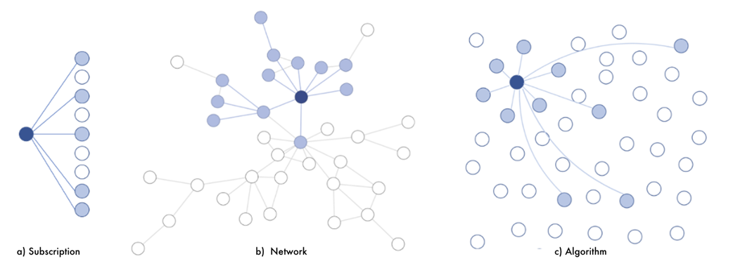 Various social media models. In the Subscription model, the content is seen only by users who explicitly follow the content producer, with no options or resharing. In the Network model, users can also reshare content from users they follow, enabling the distribution of content outside of the immediate network. Finally, in the Algorithmic model, an algorithm can add content to users’ feeds, even with no direct connection to the content itself or its author.