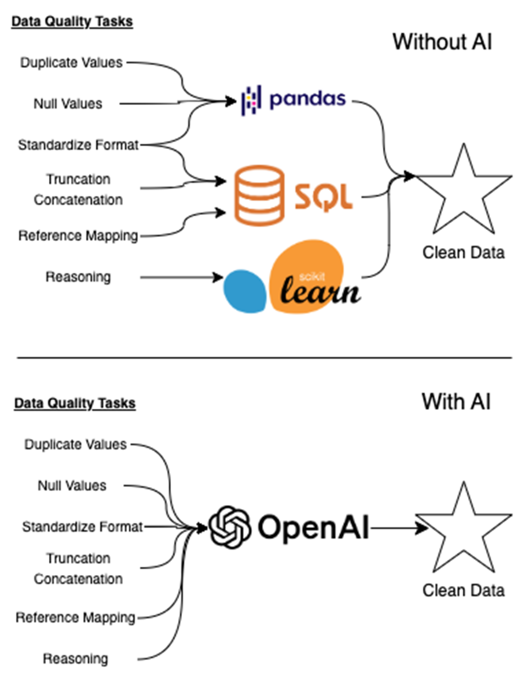 Traditional data quality pipelines often require multiple tools—like SQL, pandas, and scikit-learn—to handle tasks such as null detection, format enforcement, and rule-based validation. As shown in figure 6.1, each tool typically addresses a narrow part of the workflow. With AI, however, many of these tasks can be consolidated into a single interface. A well-prompted model can reason across diverse data quality issues, from detecting duplicates to mapping references, enabling a unified, intelligent path to clean data.