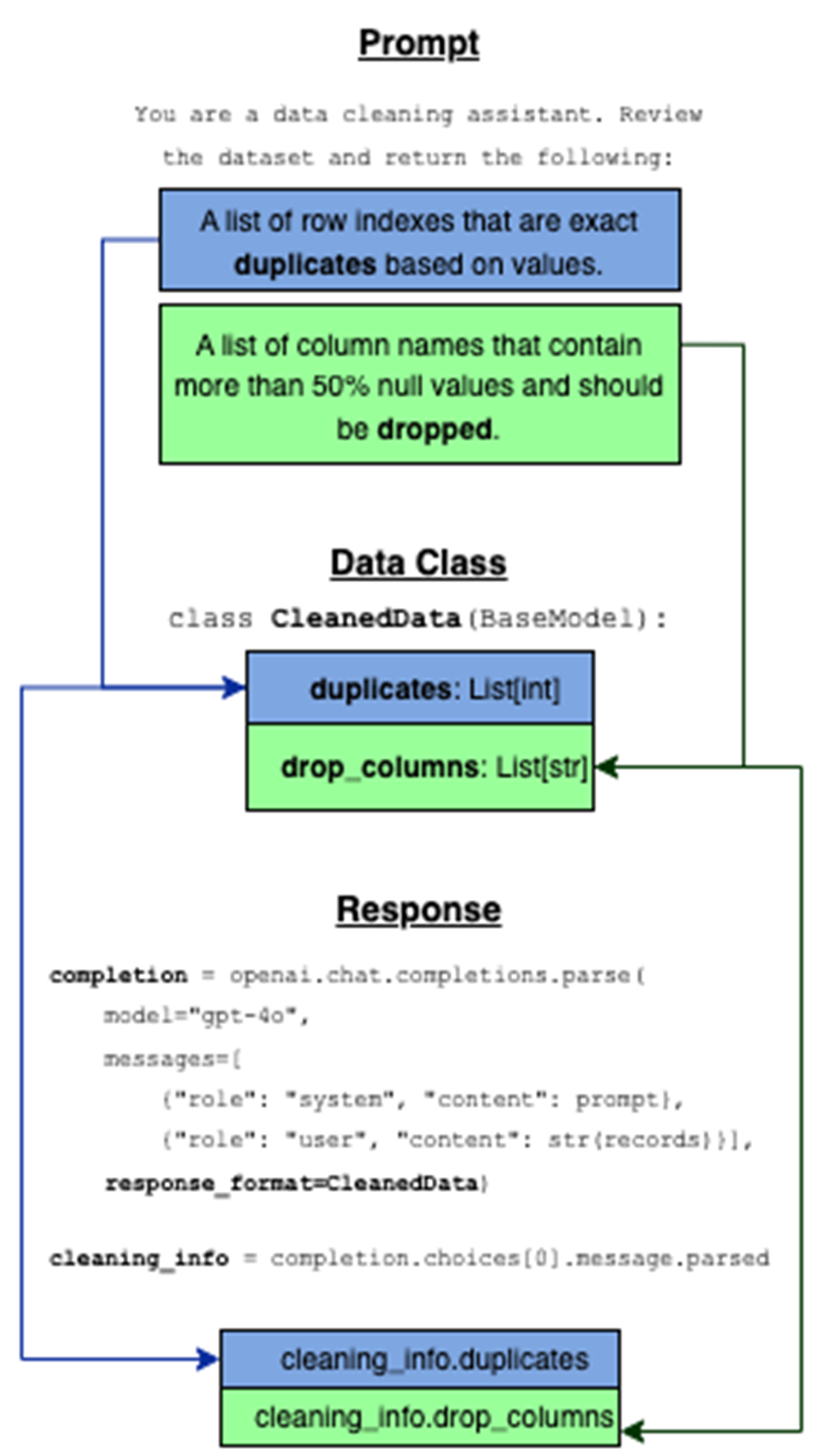 The chapter contrasts Python/pandas approaches for identifying problems (nulls, negatives, malformed emails) with an OpenAI Chat Completions workflow that detects inconsistencies via prompts. It then evolves toward reliable automation using structured outputs: response_format and Pydantic data classes define contracts the model must satisfy, turning free-form text into deterministic, parseable objects. By separating system instructions from user data in multi-message prompts, the chapter shows how to remove duplicates, drop null-heavy columns, and standardize datasets with predictable outputs that are easier to debug and integrate into production data pipelines.