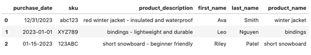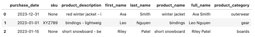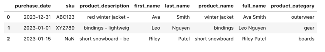 Cleaned dataset after applying AI-generated standardization rules. The AI model returned structured outputs for date normalization, SKU validation, description truncation, name concatenation, and category mapping. Each transformation was handled in a single API call using a custom response schema, producing a clean, ready-to-use dataset with minimal parsing logic in the code.