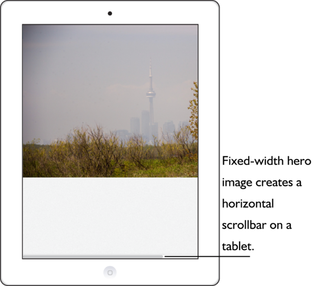 The fixed-width hero image requires a slight scroll on a tablet.