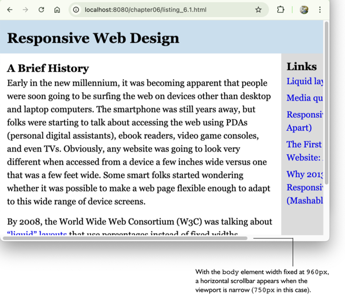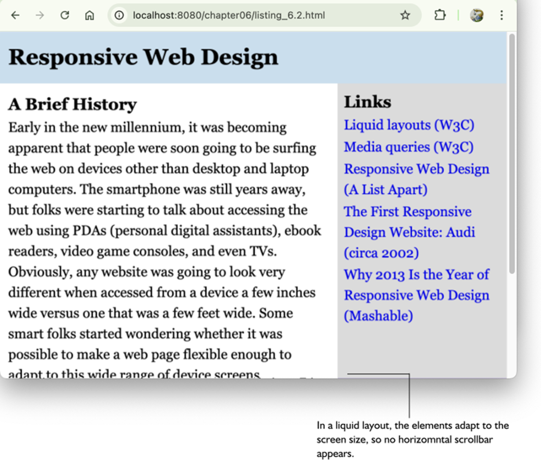 The same page from figure 6.4, now with a responsive liquid layout.