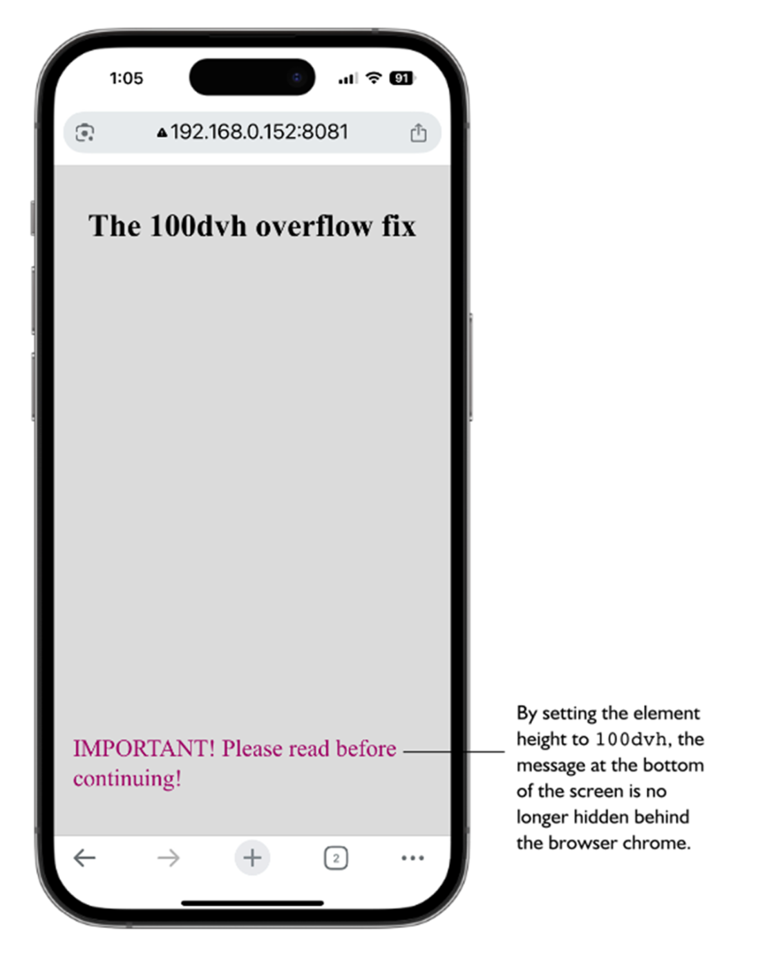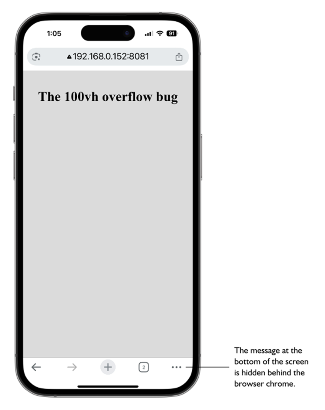 The 100vh overflow bug can cause important screen elements to be hidden behind the browser’s chrome.