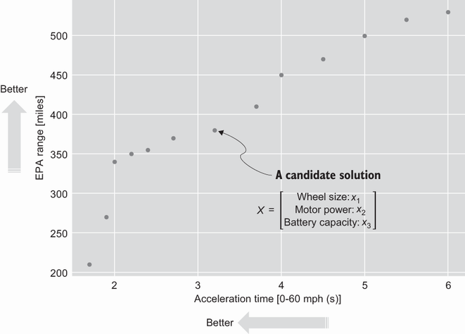 - Multi-objective: optimize several, often conflicting, criteria (e.g., minimize EV 0–60 time and maximize EPA range). Two common approaches: