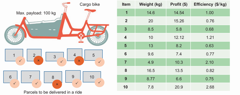 The cargo bike loading problem is an example of a problem with a soft constraint. While the weight of the packages can exceed the bike’s capacity, a penalty will be applied when the bike is overweight.