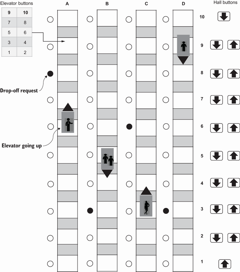 Elevator dispatching problem—with four elevator cars and 10 floors, this problem has ~1021 possible states.