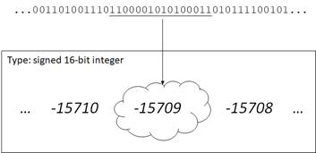 The sequence of bits typed as a signed 16-bit integer. The type information (16-bit signed integer) tells the compiler and/or runtime that the sequence of bits represents an integer value between -32768 and 32767, ensuring the correct interpretation as -15709.