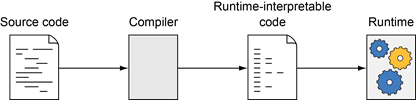 Source code is transformed by a compiler or interpreter into code which can be executed by a runtime. The runtime is either a physical computer or a virtual machine, like Java’s JVM, or a browser’s JavaScript engine.