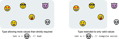 declaring a type correctly we can disallow invalid values: the first type is too loose and allows for values we don’t want (😈, 💀). The second, more restrictive type, won’t compile if the code tries to assign an unwanted value to a variable.