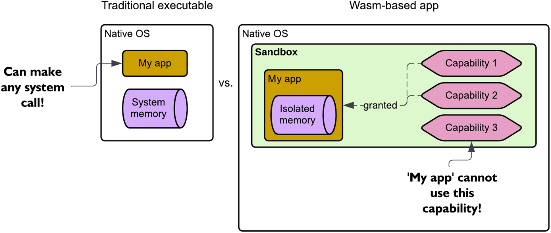 A native (traditional) application security model vs. Wasm's capability-based security model.