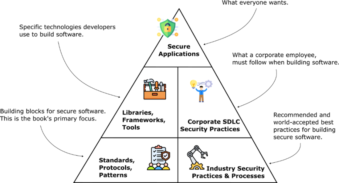 Layers at the top depend on the layers below them. All the layers are required to produce secure application. The standards, protocols, and patterns used to secure applications are the primary focus of this book, they are the foundation that you need to use security libraries in your application effectively.